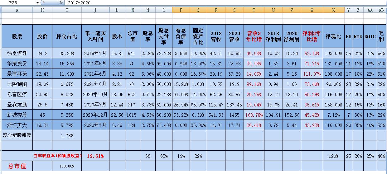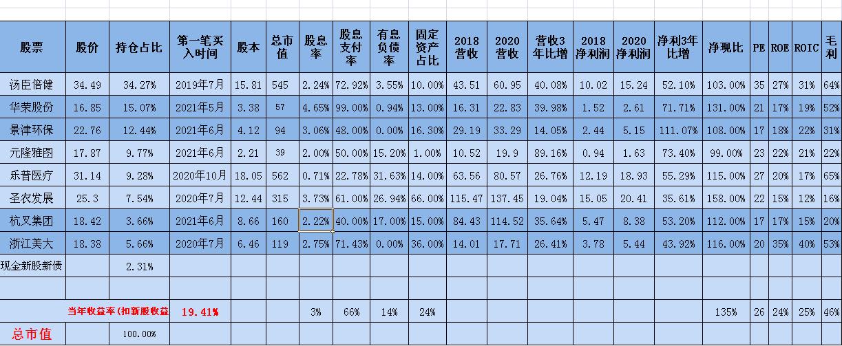 2021年截至本周浮盈只剩下19.51%(不含新股收益,今年中签6只新股收益尚可,没有大肉签,希望下半年运气能更好点),本周主要受第一重仓汤臣倍健及其他持仓股调整浮盈缩水,但三成的汤臣倍健仍持仓未动,把它当做我的喜诗糖果了。