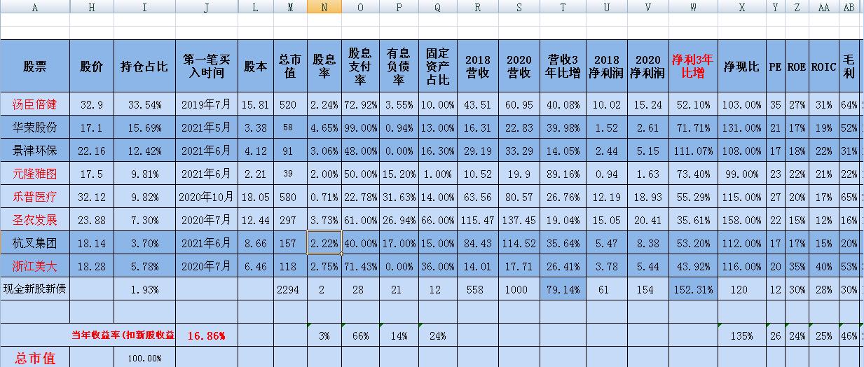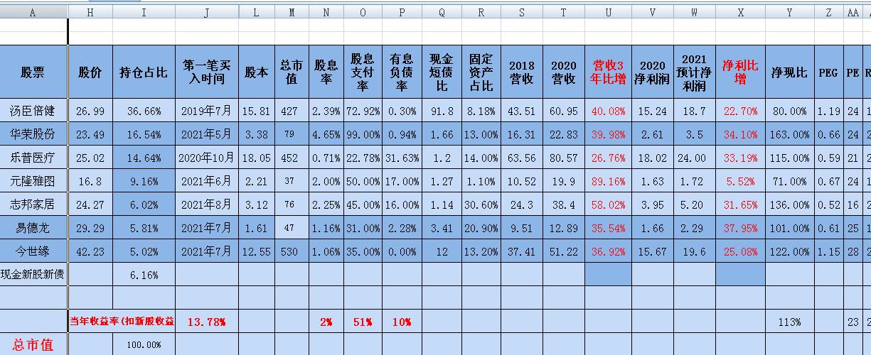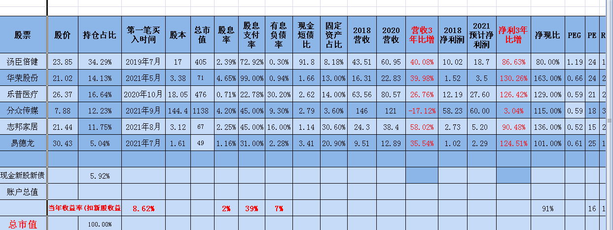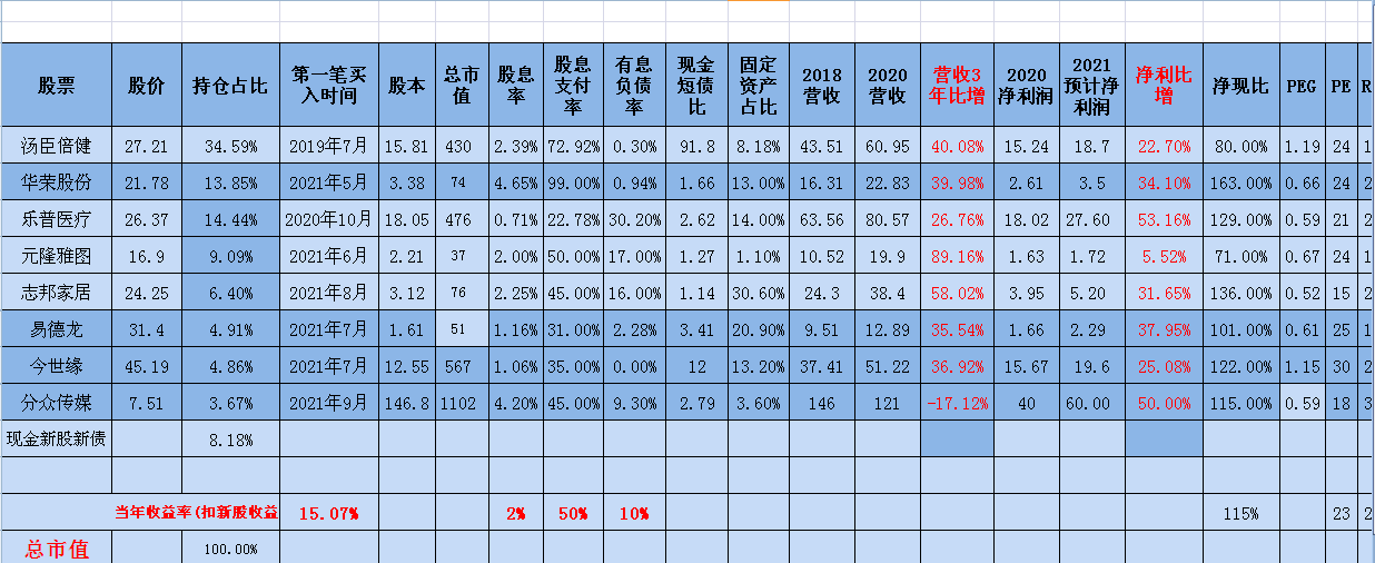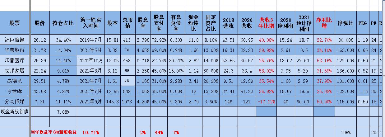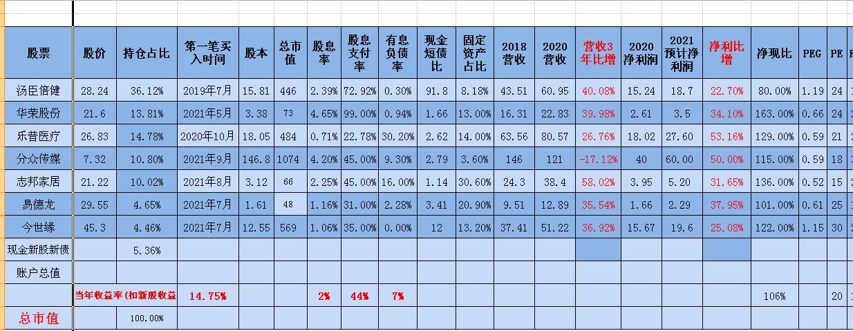 2021年截至本周扣新股后浮盈9.41%,持仓仍然是汤臣倍健、乐普医疗、华荣股份、志邦家居、分众传媒这五只,目前持仓亏损最大的是乐普医疗、志邦家居,只能慢慢熬了,希望剩下的一个半月能有所斩获。另外没想到11月初相继清仓的今世缘、易德龙继续大涨,虽然远离才5%的持仓,但是现在看真是亏大了,一卖就飞。