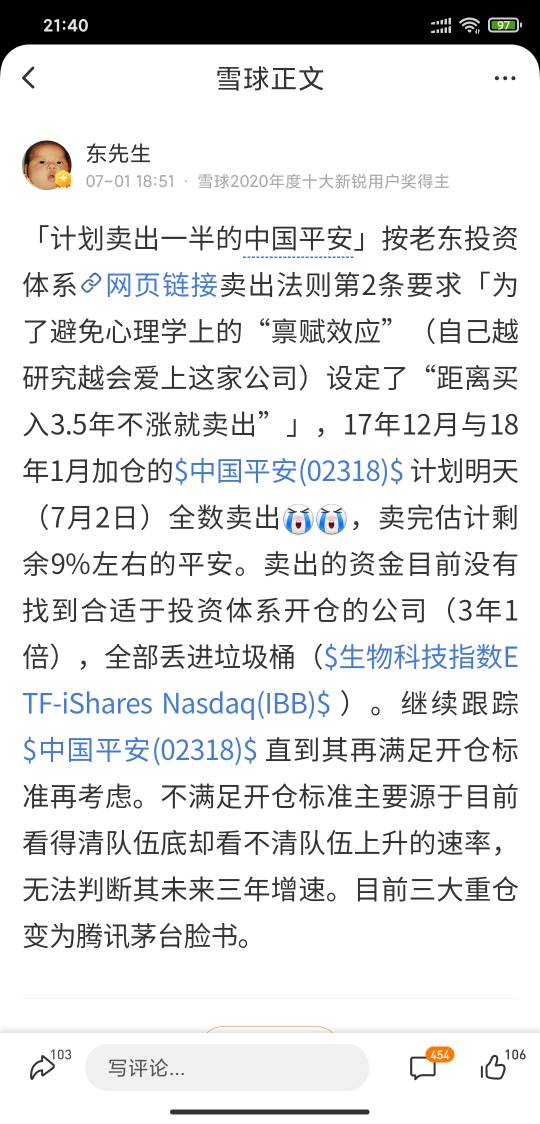 写读懂保险股的雪球大V减持平安仓位了,看来保险真是坑人,俺这两年也深陷平安陷阱,还好6月清仓了。现在保险的商业逻辑不一定存在了,互联网消费保险对平安等冲击大,我现在看看十多年前给孩子买的保险真是傻了,还要再交8年智商税。现在全家只买支付宝或微信的消费型医疗险,类似车险。