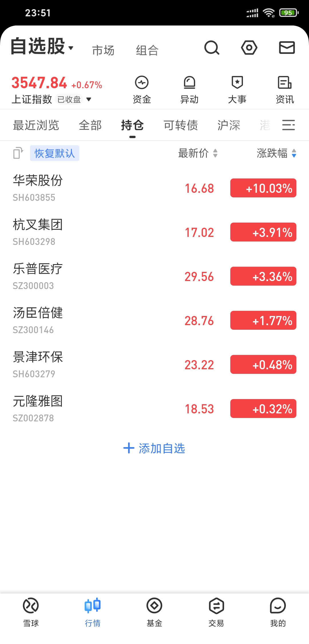 目前持仓七只个股,浮亏达15-20%有乐普医疗和元隆雅图,希望这两只能够慢慢有所起色,近期刚建仓的今世缘、志邦家居、易德龙在盈亏平衡点浮动,汤臣倍健和华荣股份浮盈都超过30%,近期最后悔就是因为二股东清仓减持放跑今年翻倍的牛股景津环保。。