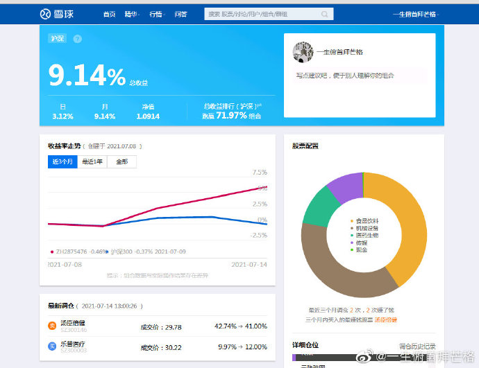 截至2021年9.30扣新浮盈14.75%,目前还是集中仓位在大消费、大医疗、大制造,虽然看着周期股赚钱很羡慕,但是还是坚持自己看好的,每个人都要为自己的认知负责,之前圣农发展亏钱就是前车之鉴。
