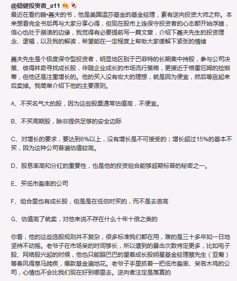 费雪这段话说清楚了成长股的优势,只要企业成长,股利也随之成长,虽然股息率不高,其实房产投资也类似,太注重租金反而房价很难上涨。