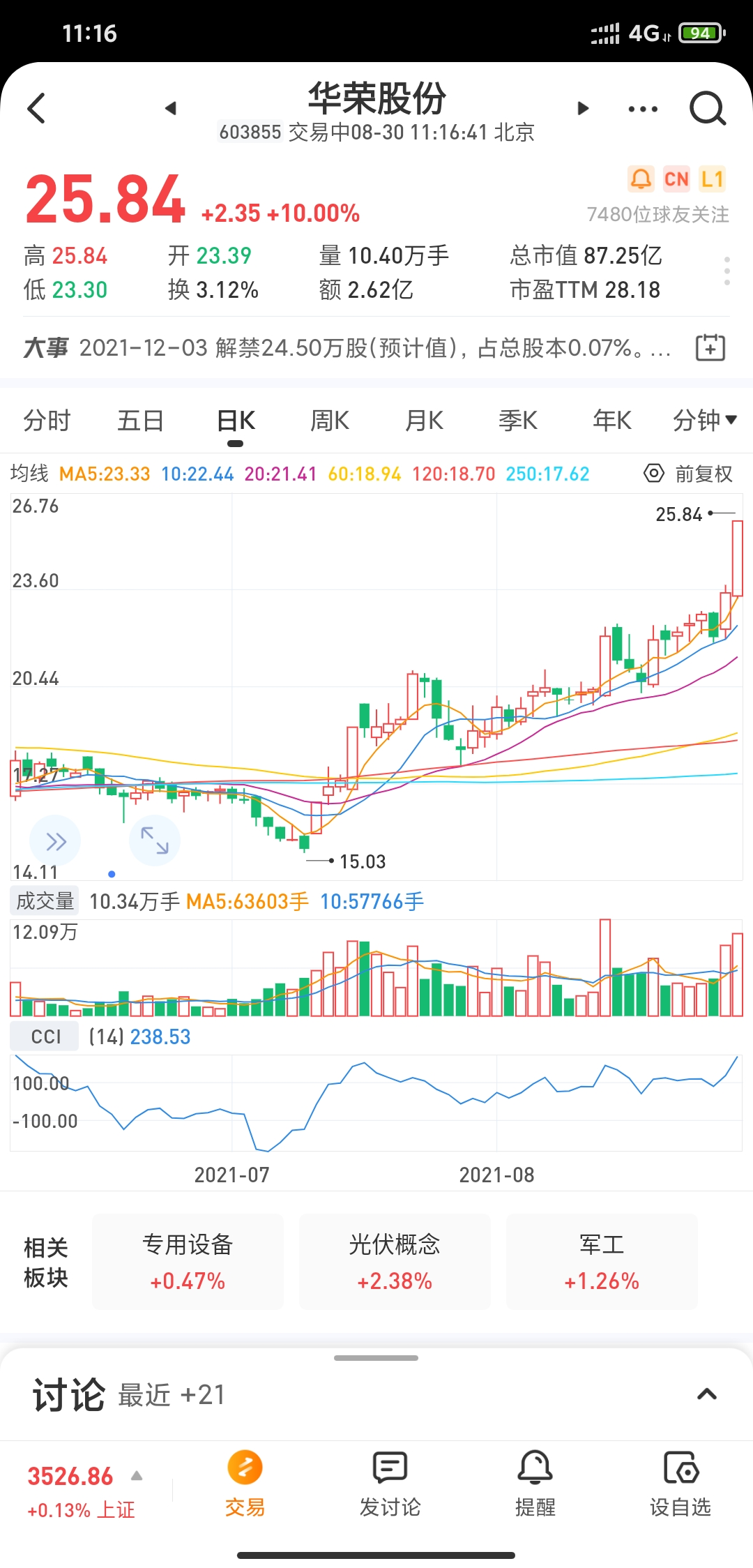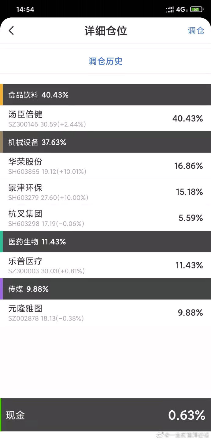 芒格信徒的投资心得# 今年下半年就靠华荣股份这只大牛,还有之前放跑的景津环保撑住了浮盈,不然超级重仓的汤臣倍健和乐普医疗的下跌根本就把盈利吐光了。现在策略是大涨就减持,大跌就加仓,华荣股份的仓位控制在15%左右,准备跌破400亿市值继续加仓汤臣倍健,汤臣倍健大跌后持仓从40%缩水到35%了。