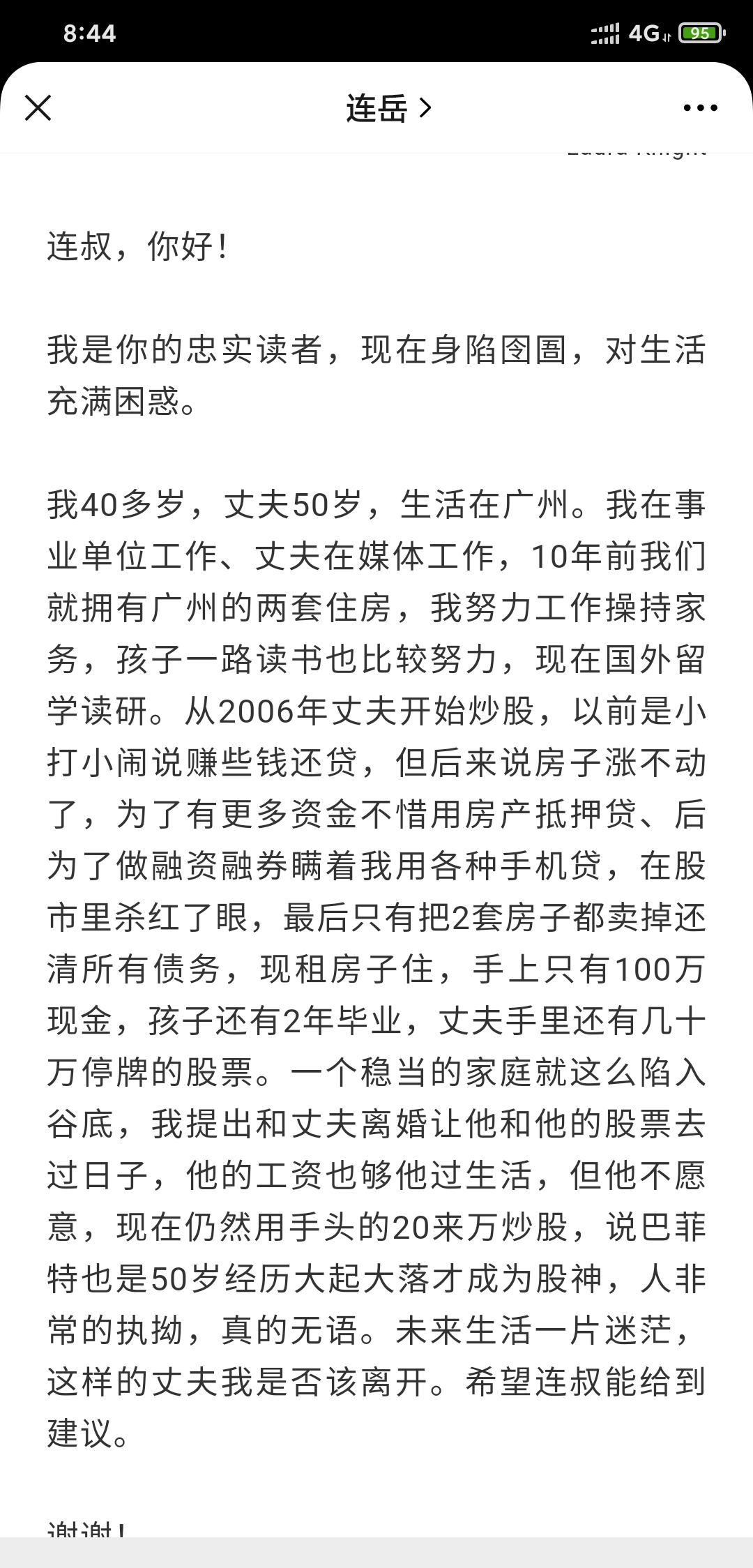 看了投资大师费雪的次子对费雪晚年的回忆,费雪晚年也是痛苦不堪,因为得了老年痴呆症,投资业绩也不像壮年时候惊艳了。相形之下,巴菲特和芒格的晚年更幸运,身体才是革命的本钱,没有健康其他都是转头空。。