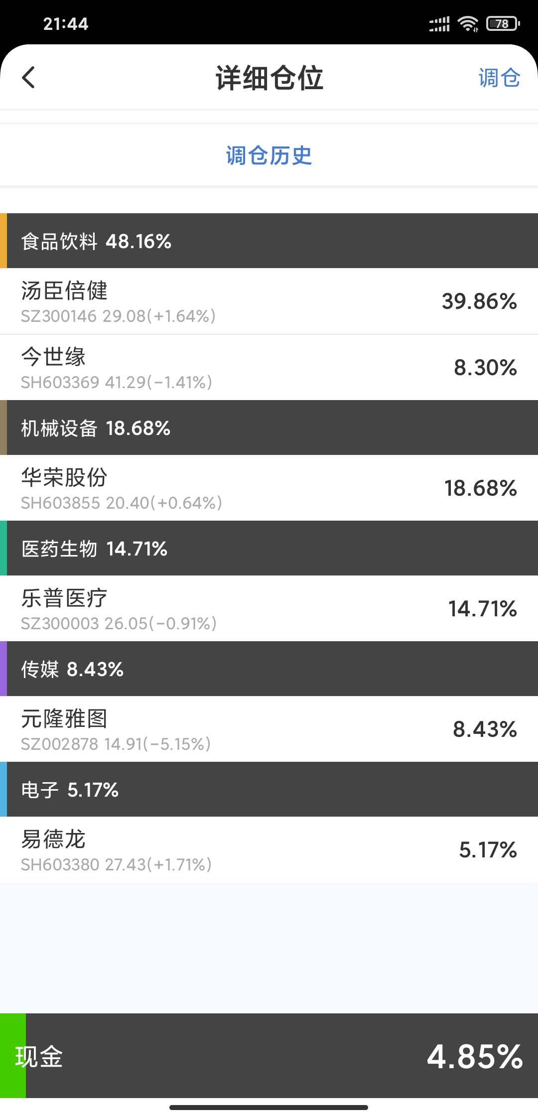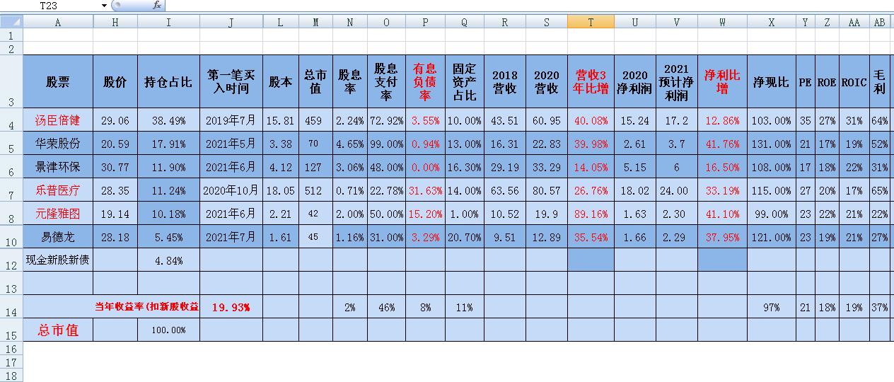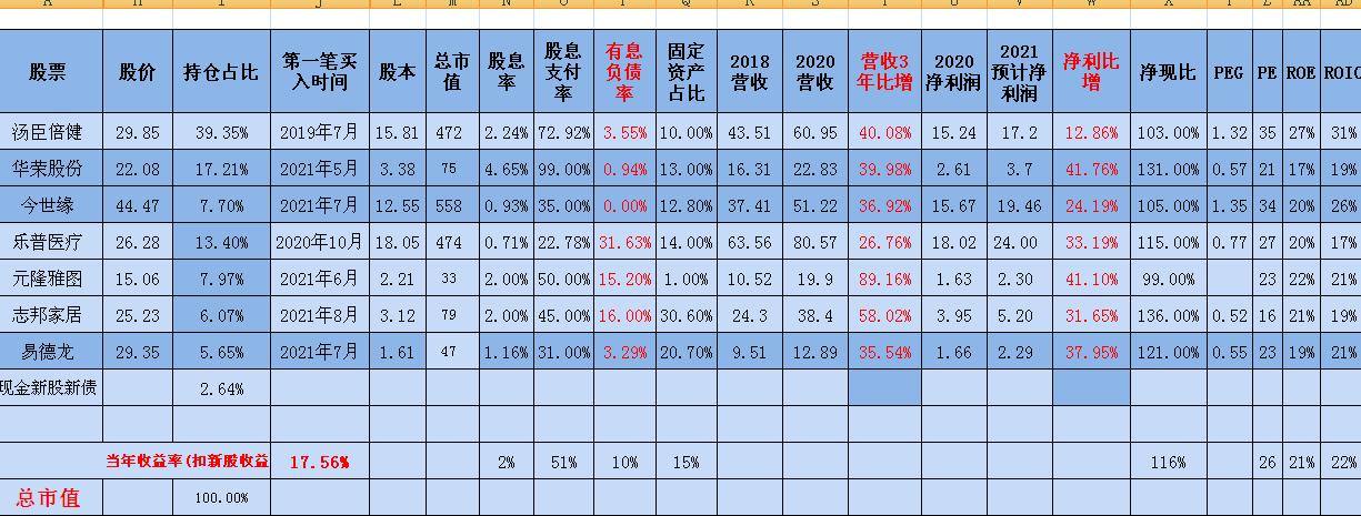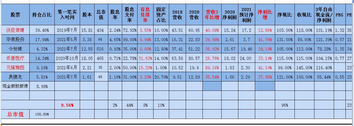 现在持仓相对合理了,除了圣农发展外都是轻资产行业了,而且基本属于低有息负债甚至0负债的企业,主要就是看企业经营业绩了,特别是中报能否继续保持成长,成长永远是投资的主线,像地产虽然也成长,但是市场担心过几年因为高杠杆不成长甚至暴雷,低估是投资的风险把控。。