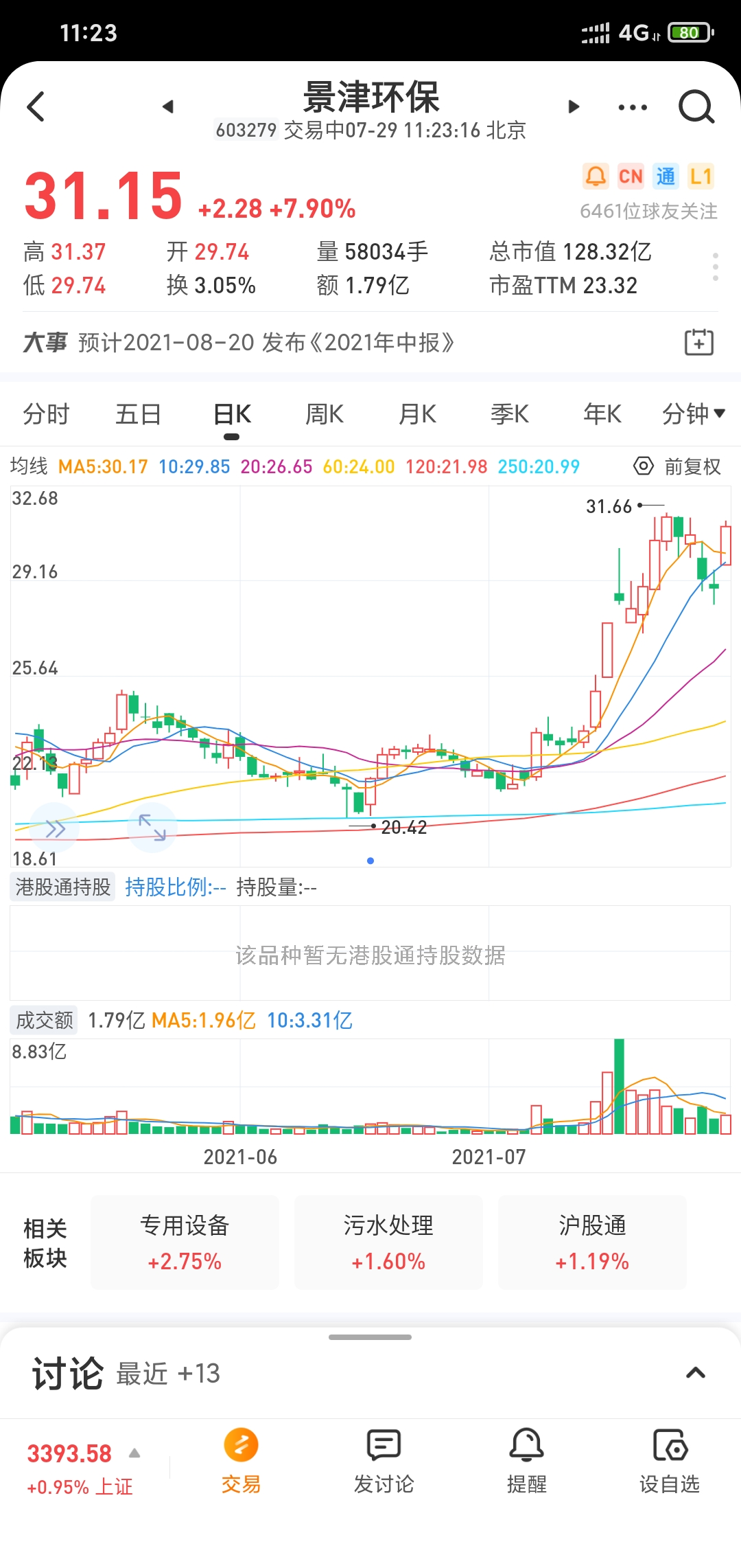 这两天跌的真是惨不忍睹,扣新浮盈只剩下13.47%了,今天早上开盘就清仓景津环保了,原因是短期涨幅较大,二股东又要大幅减持,所以先落袋为安了。后来看今世缘开始拉就第一次买了5%的白酒今世缘,没想到下午所有股票都翻绿大幅重挫,真是覆巢之下焉有完卵。。