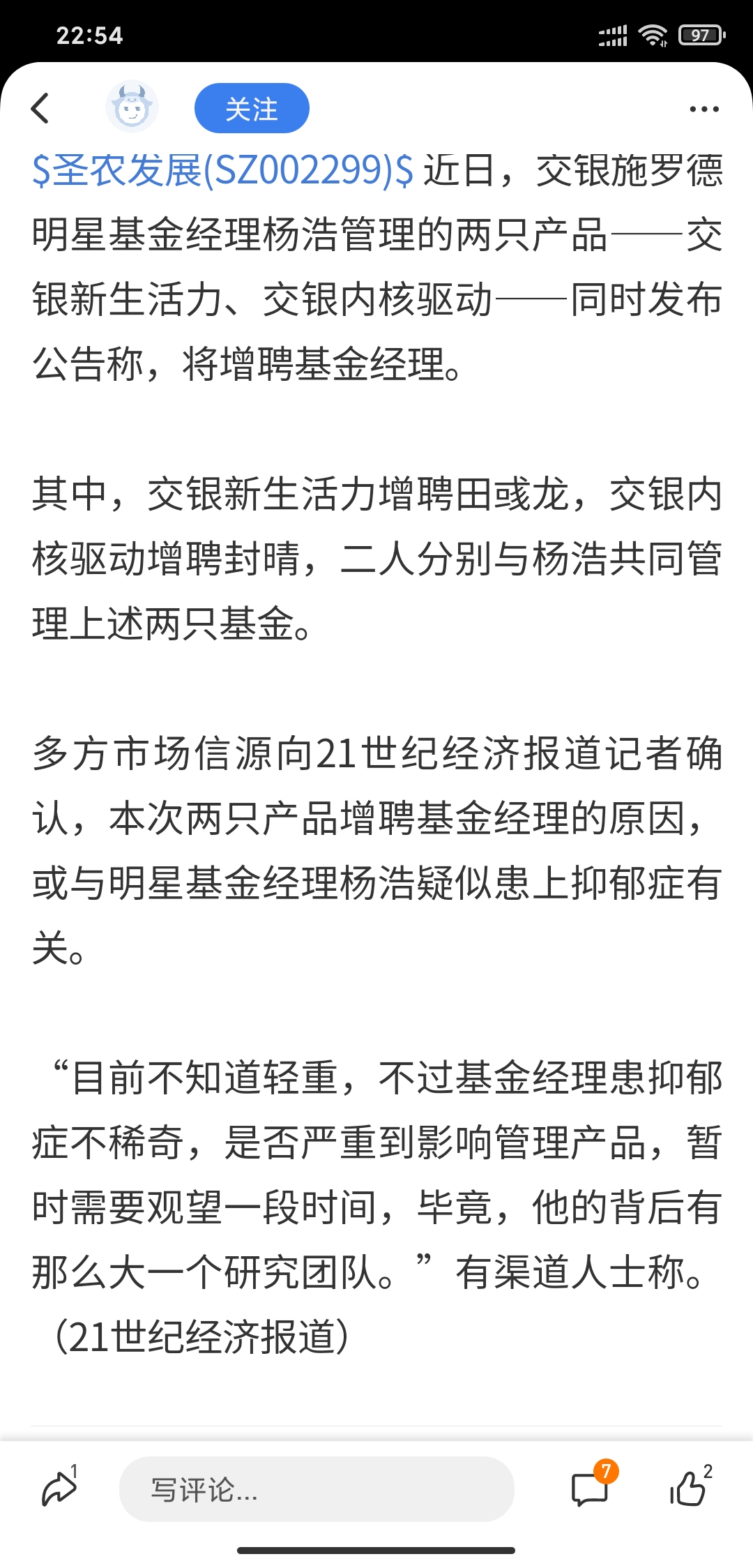 基金经理也是压力巨大,成王败寇,今年杨浩的表现确实差强人意,看来投资不能形成路径依赖,要学会与时俱进,几个月前我清仓杨浩基金就是觉得他的持仓虽然都是成长股,但是估值太高了,价值投资须牢记成长与低估不可偏废。。#芒格信徒的投资心得#