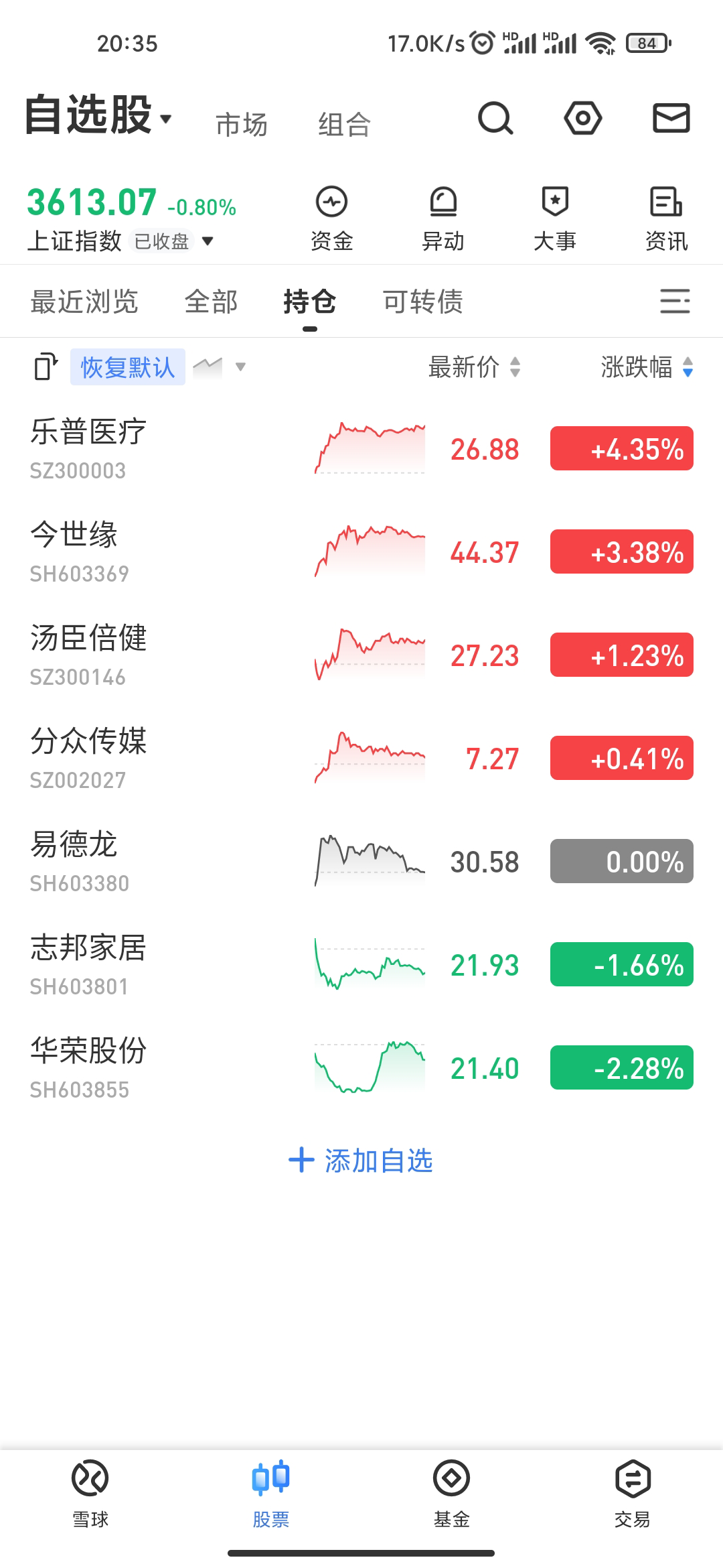 本周加仓了分众传媒、志邦家居,志邦应该是最早把恒大清理出大宗业务的定制商,而且现在采取的加盟代理商与地产商签约的加盟大宗模式,业务的风险已经大幅降低了,但现在属于杀地产产业链估值的状态,继续等待机会择机加仓。