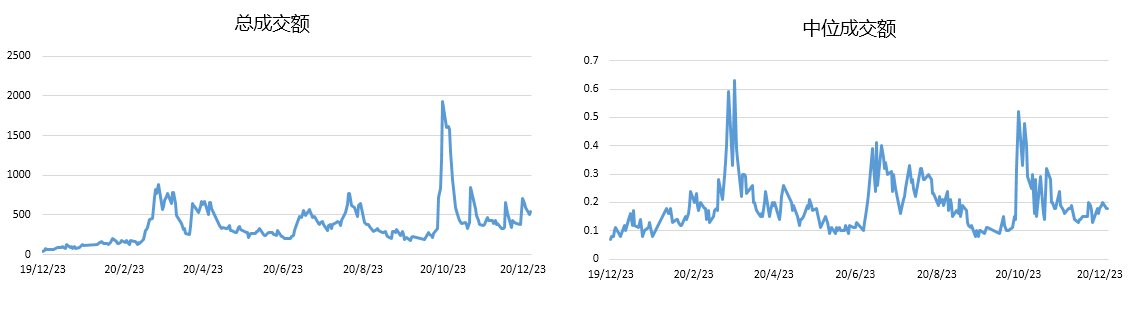鉴于转债市场扩容明显,只监控总成交额有失偏颇,故增加单券成交额口径。为了避免妖债影响,故采用单券中位数成交额。