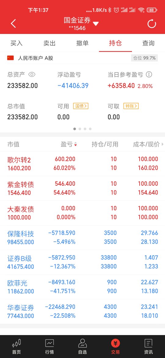 账户为了省手续费用的老婆的,天天不求赚钱就怕亏钱,但个股很久没玩了,转债赚两三块跑路这习惯真心垃圾[捂脸]。