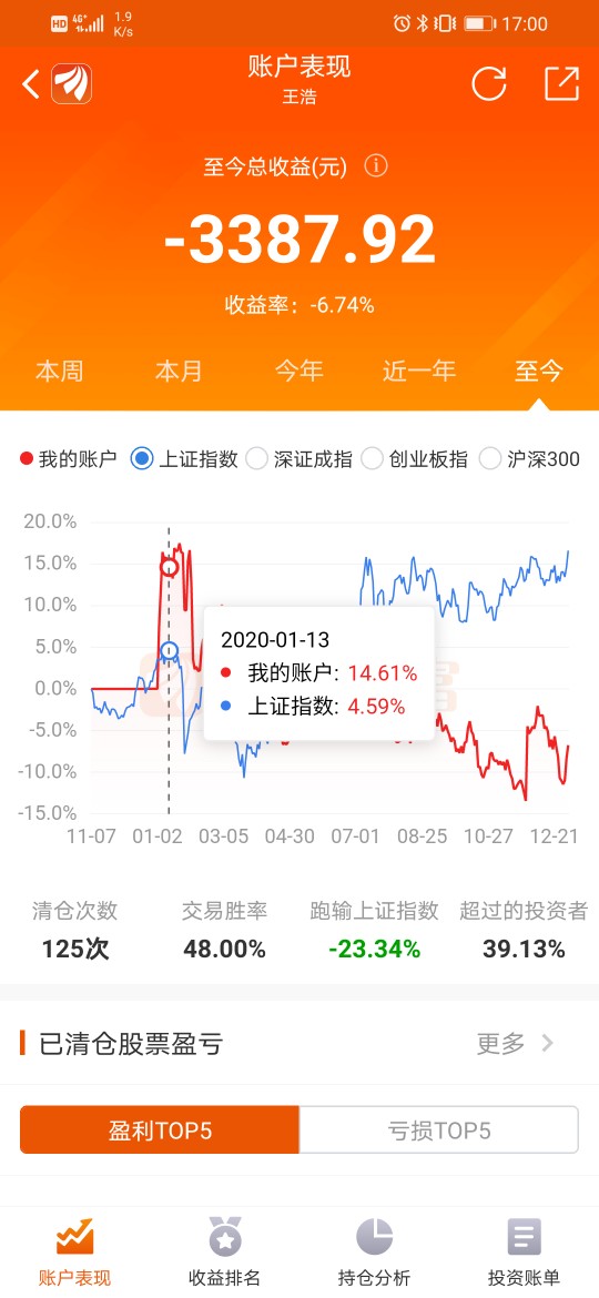 账户后半年从浮盈几万到目前亏15万 亏损的几个原因如下1)买了暴雷后超跌股 以为利空出尽待反弹 而且重仓 每只股票40-50万 最后没等来反弹 每个亏好几万离场 2)自己没有自己认为的那么有耐心 3)后来麻木了 不想办法自救了 没有深挖原因,及时给出path to red 的方案,做出调整。4)没有系统的学习,虚心了解别人怎么赚钱的,在黑暗中摸索自己的方式。他关注最多的是一个短线操作大V,他也总骂他误导自己。那还关注干啥?