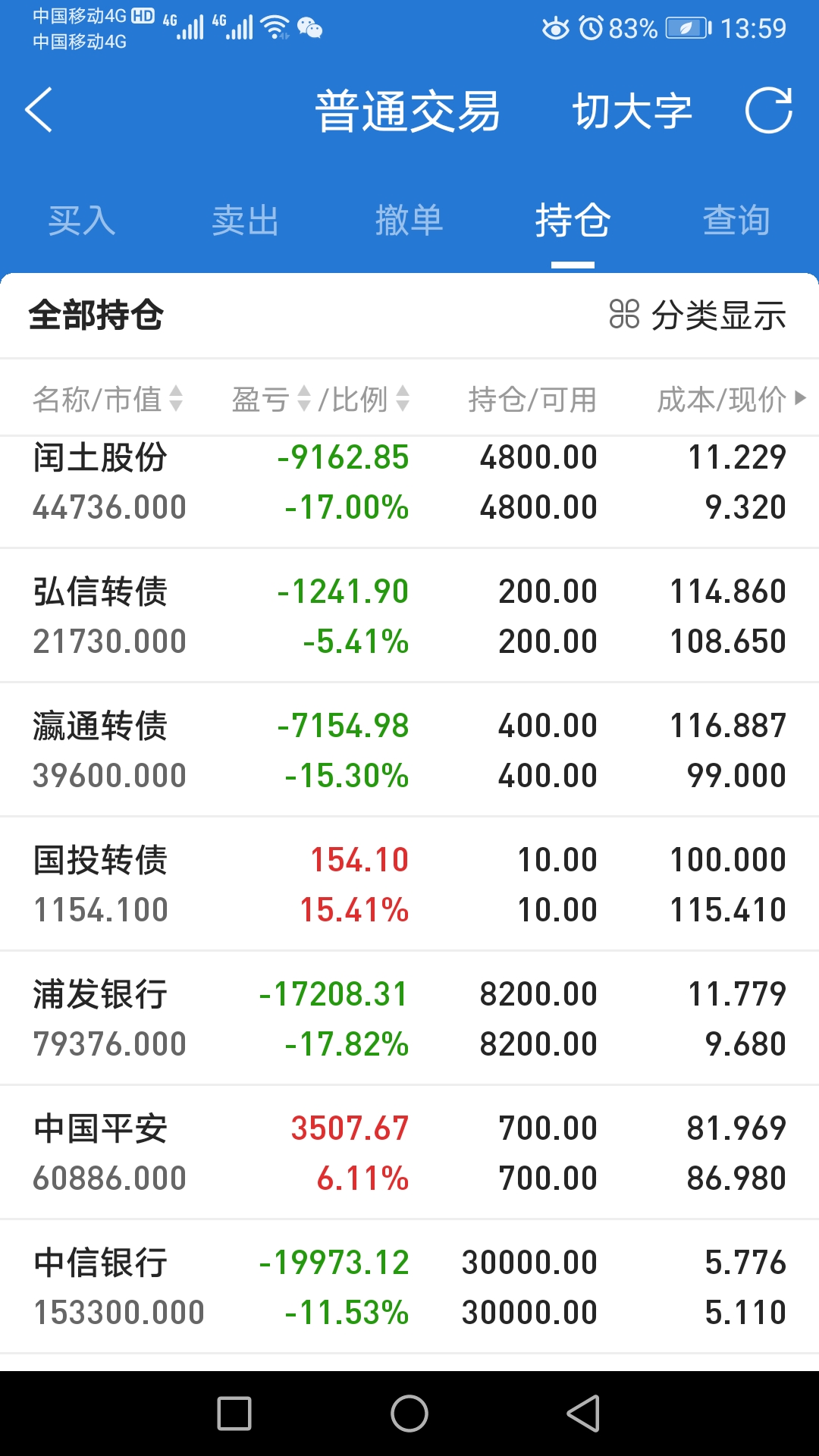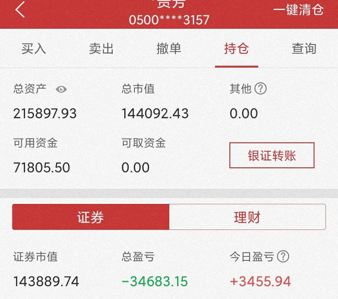 这个亏损的账户300ETF是换仓if了结果不亏,油气已经止损了算是是永久性亏损,银行股为了收点分红,平均本金亏损5%以上,年中的2次脉冲都没跑,下次再有脉冲机会先跑一半看看行不行,希望不要一去不回。其它就是可转债了,低价大饼,等风来半天就扭亏了,不着急。(今年油气的亏损是最难受的,以后商品类的再也不玩了,就是学费有点贵)