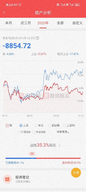 我去年年初才入股市,之前都认为a股只有茅台是价值企业,年初入了南方原油的坑,摔的有点重,不过通过大v找到jsl,学习了套利亏本手艺(信息时代有点不适合玩了),疫情反应有点慢,选股能力比较差,看见口罩熔喷布几个涨停板不敢上,想歪心思找上游企业,卫星石化(疫情期间资金不来,顺周期倒长的比较猛,没拿住),疫情成都红旗连锁一直在经营,大家也要囤面条(克明面业),这两个股冲了一波就下探了,红旗最惨,蹭免税概念,吸引大量散户,柚子毫不客气的往死里割,现在回想当时的想法只适合短线,长线超市生意重资产薄利,竞争还很激烈,不是好生意。下半年开始学习小孩,影儿大佬如何选择基金组合,很稳不慌。去年总体没挣钱,挣了经验,今年补财务知识,培养交易心理。以优质基金为主,以市场整体估值和市场情绪作为加减仓判断基础,场内场外基金摊平成本,以双低基本面可转债,龙头股,低估行业etf网格为辅。手机打字想到哪写到哪,今年继续跟大佬们学习,祝所有jsler财运亨通