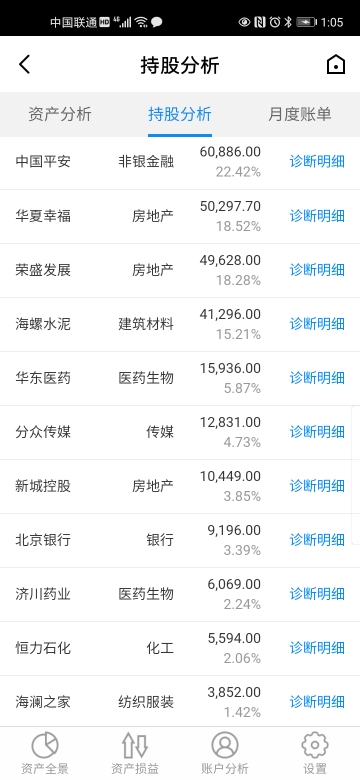 截图里华东医药,分众传媒,恒力石化是正收益但仓位都很小。华夏幸福,荣盛发展每个亏1w左右吧。