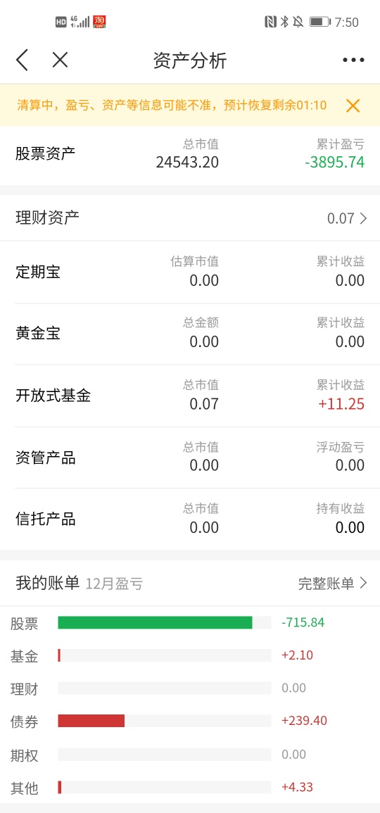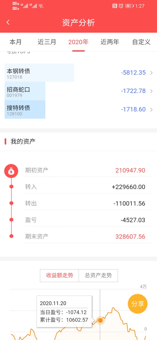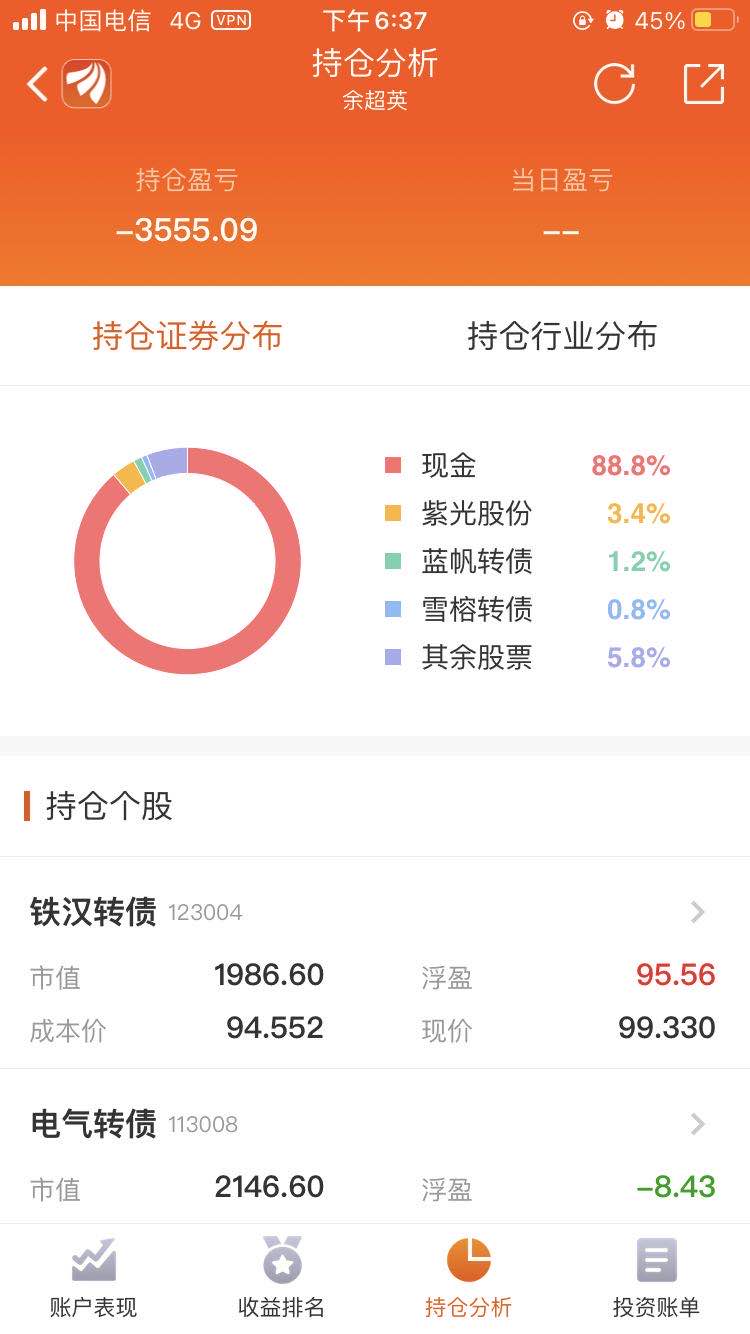 另外一个账户是今年8月给孩子的账户,开始买了基金和转债,11月赎回大部分基金,然后碰到转债大跌,持有的天创转债,一言难尽。唉