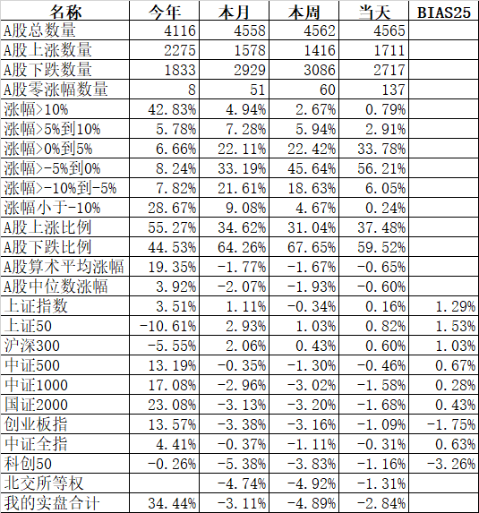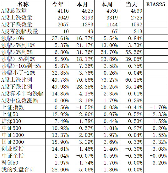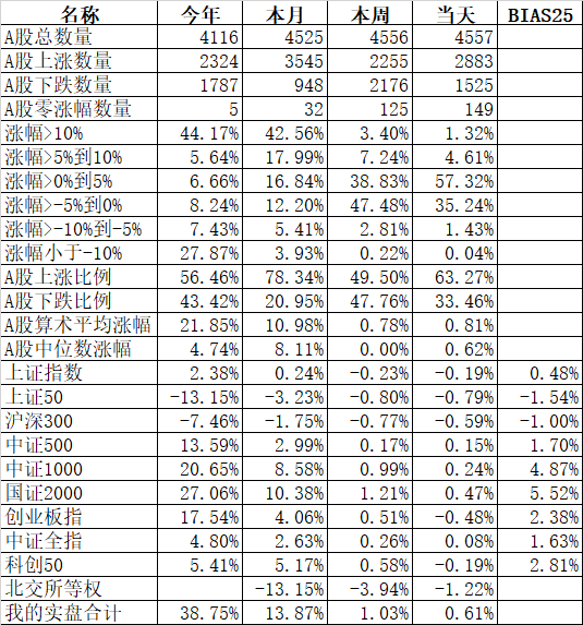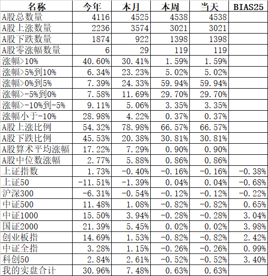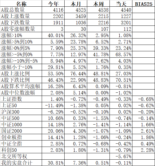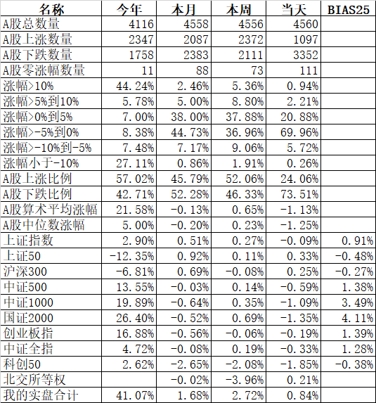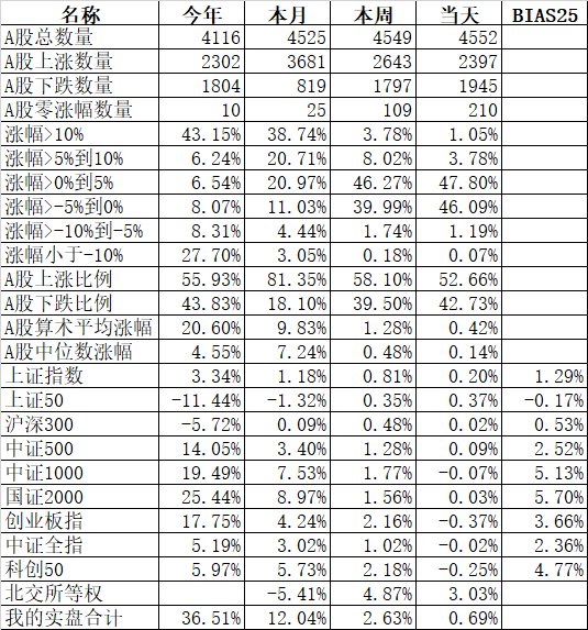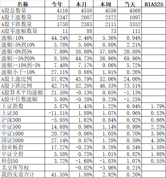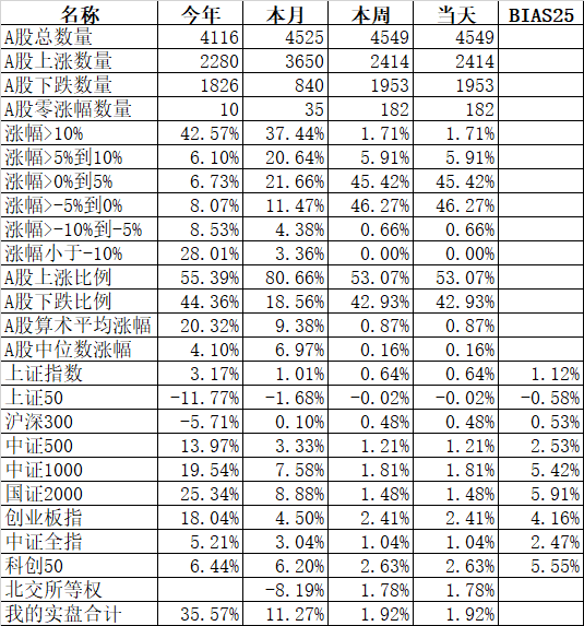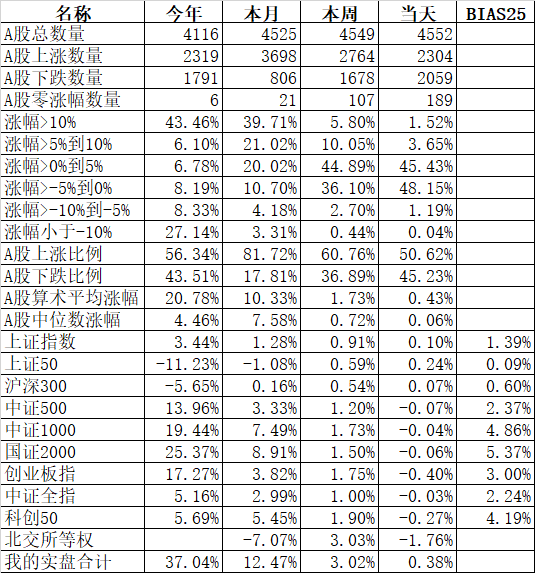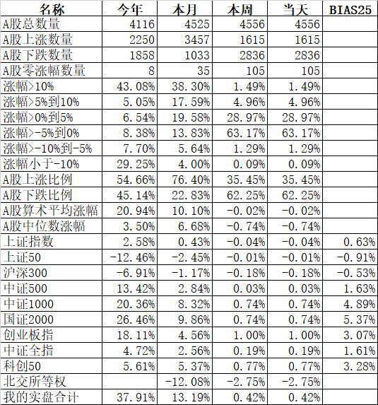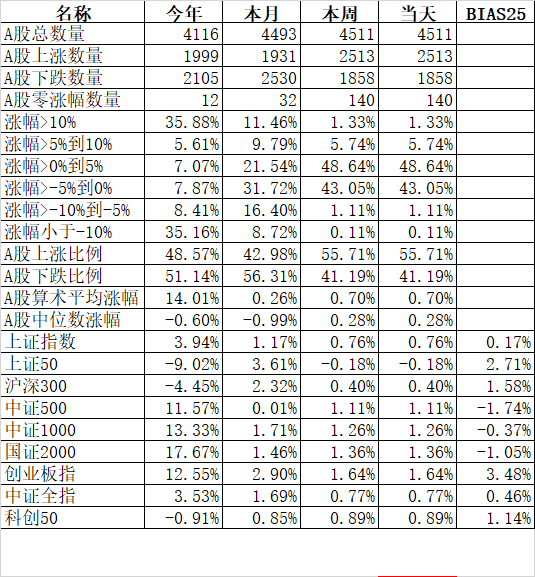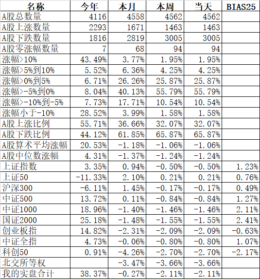 今天市场涨少跌多,电力、矿物制品、电气设备等领涨,煤炭大跌,另外家居用品、文教休闲、医疗保健、农林牧渔、石油等一路下跌。宽基指数涨跌不一,但涨跌正负都没超过1%,个股中位数跌0.54%,导致今年中位数涨幅为0,2056只上涨,2051只下跌,10只0涨幅。