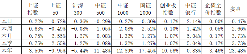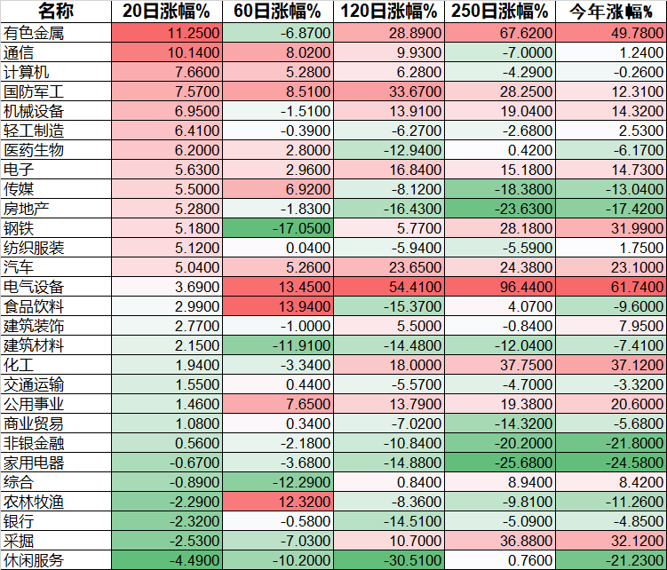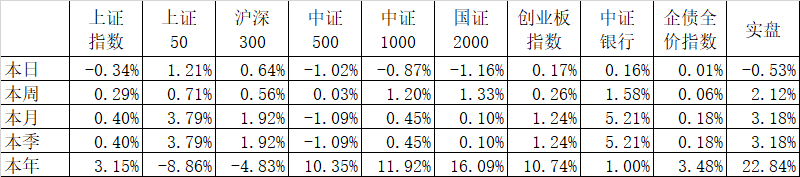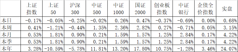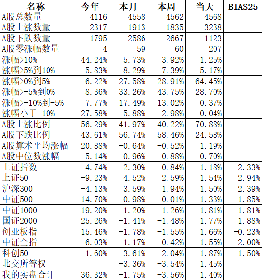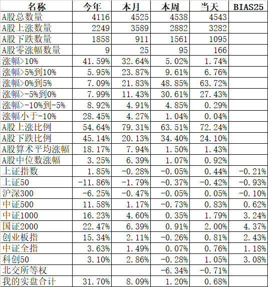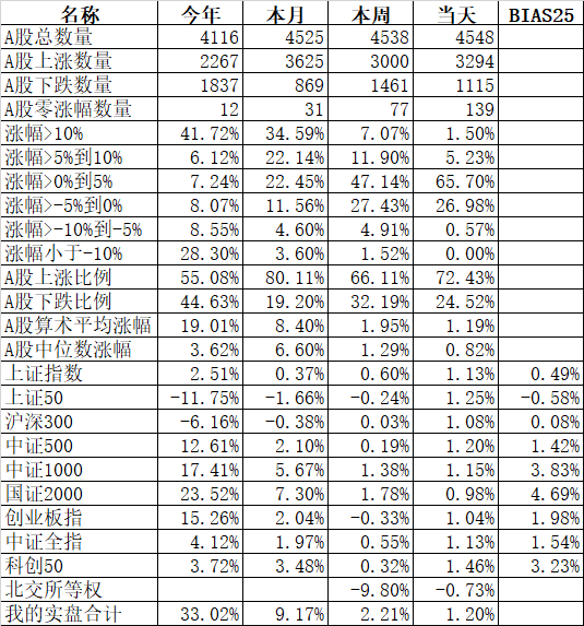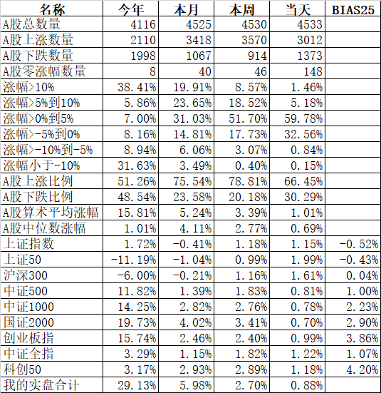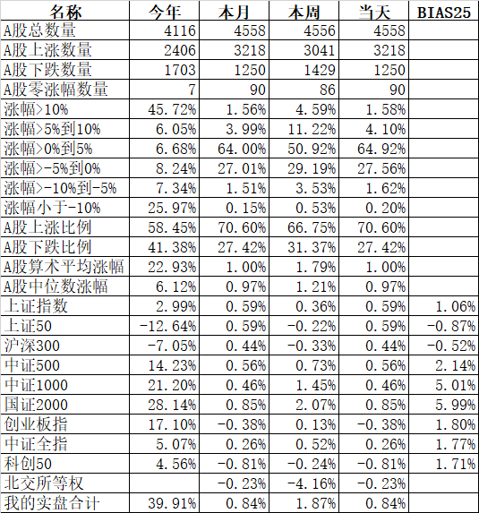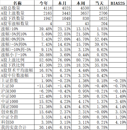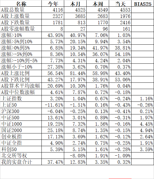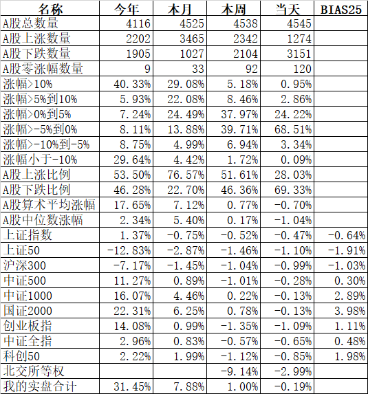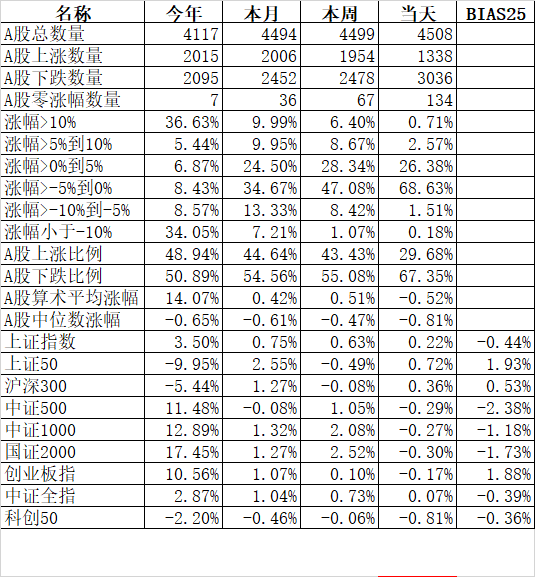 今天市场涨少跌多,电力、矿物制品、电气设备等领涨,煤炭大跌,另外家居用品、文教休闲、医疗保健、农林牧渔、石油等一路下跌。宽基指数涨跌不一,但涨跌正负都没超过1%,个股中位数跌0.54%,导致今年中位数涨幅为0,2056只上涨,2051只下跌,10只0涨幅。