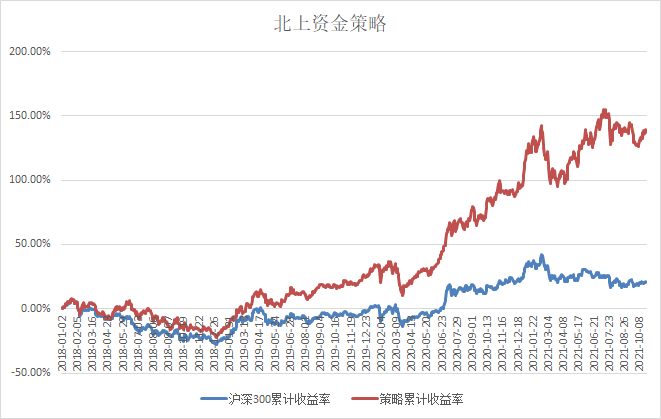有人会说这仅仅是1周的数据,不能说明什么,那么我们看看从2018年1月1日这年熊市开始,到2021年10月22日收盘,近4年的时间,跨过了熊市周期的表现,我们用61个交易日为标准,因为正好是一个季度的平均交易日,按照61个交易日的北上资金净买入排序,取前20个股票平均持有,同时61个交易日轮动一次,卖出排序20名后的,买入排序20名前的,单向交易成本按照千二计算: