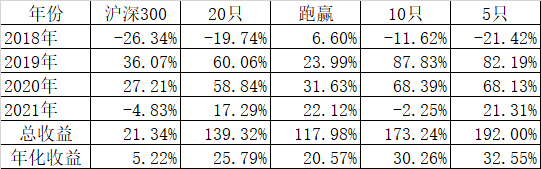 结果我们看到,近4年,沪深300指数涨幅是21.34%,年化是5.22%;而平均持有20只的总收益是139.32%、年化是25.79%。如果平均持有10只、5只,那么总收益可以达到173.24%和192.00%,年化也水涨船高。