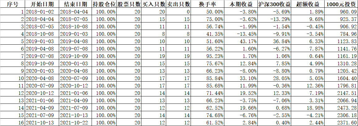 我们通过果仁网看一下4年来的16次换仓,平均1年4次绝对算低频的,16次里有7次是亏损的,而且在2018年这4次是连续亏损。和沪深300相比,16次里有3次是跑输的,而且第15次轮动从今年的7月9日到10月13日,亏损6.76%,和沪深300相比跑输4.21%,是历史上跑输最多的一次。