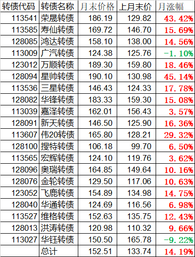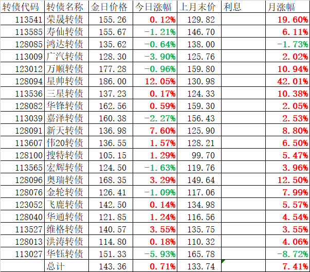 今天市场高开高走皆大欢喜,70%以上的股票上涨,各大指数均上涨1%以上,涨的非常均匀。可转债也是绝大部分都上涨,我的实盘昨天大跌的一半失地今天收复了,广汽到期只有32个交易日了,再要在20个交易日里有15个交易日股价满足强赎条件难上加难,乘今天涨的不错卖了后换了海印。没想到下午继续上涨,但昨天卖出的伟20转债,今天确实跌了1.11%,成为今天非常少数下跌可转债里的一员。