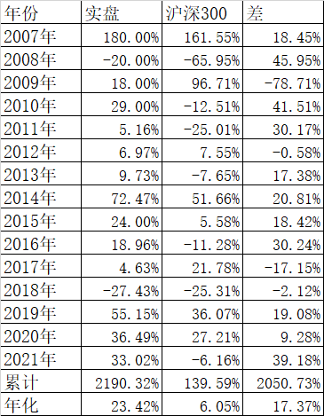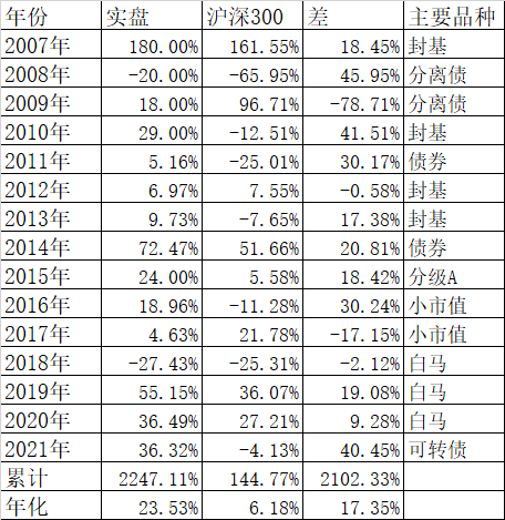 最后贴一下从2007年开始入市14年来的收益率,14年涨幅1621.82%,年化22.54%,超过了同期最好的公募基金华夏大盘,同期华夏大盘是1473.83%,年化21.76%。最关键的不是在牛市,而是在熊市,如2008、2010、2011、2013、2016等年份,主要也不是靠股票,而是靠债券、封基、分级A、可转债等另类品种大幅度战胜了基金。依靠品种的广度战胜了深度。