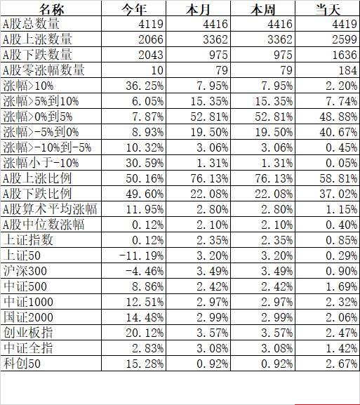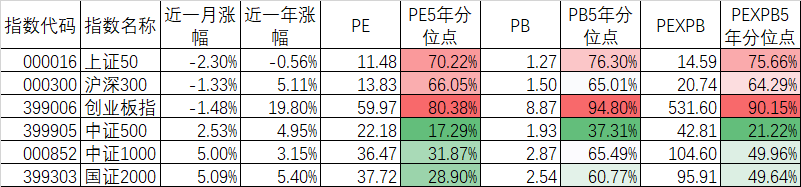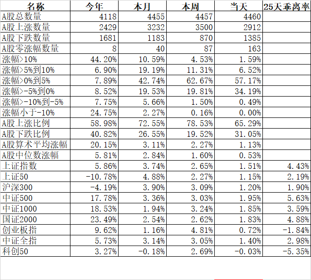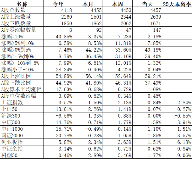 在各大宽基指数中25天乖离率今天上涨50和沪深300由负转正,而中证500(4.01%)、国证2000(3.39%)、上证指数(3.14)、中证1000(2.02%)继续强势,最弱的还是科创50(-5.63%)和创业板指(-2.81%)。