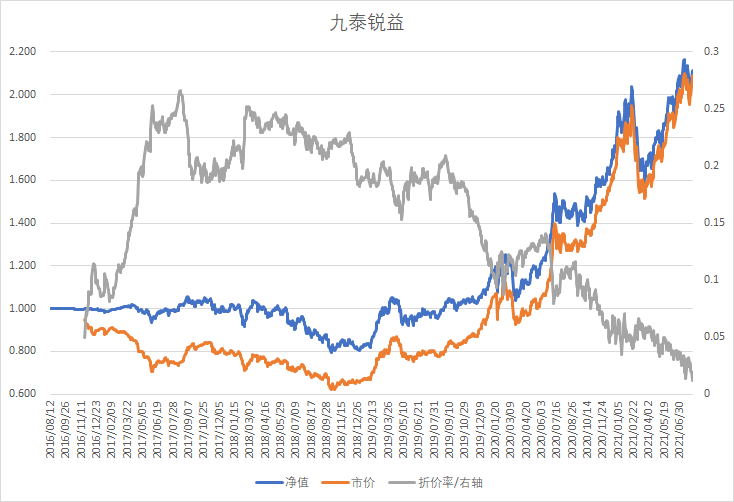 2019年牛市开始了,九泰锐益净值涨了37.04%,但市价涨了48.48%,折价率继续缩小到11.71%;2020年继续牛市,九泰锐益净值再涨61.71%,市价涨的又是比净值多,达到73.57%,折价率继续缩小到5.24%。今年九泰锐益净值涨了17.71%,市价再涨22.75%,折价率终于缩小到1.18%这个历史最小折价率了。