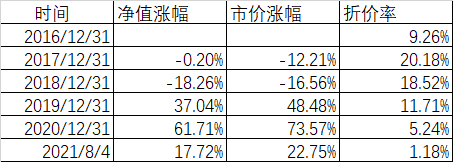 如果看图还是看不清楚折价率扩大或者缩小对我们的影响,那么看上表就更加清楚了:2017年开始的时候,折价率是9.26%,这一年九泰锐益净值微跌了0.20%,但持有者看到净值涨不上去,心态变坏,结果市价跌了12.21%,折价率从9.26%一下子扩大到20.18%,形成了典型的戴维斯双杀。