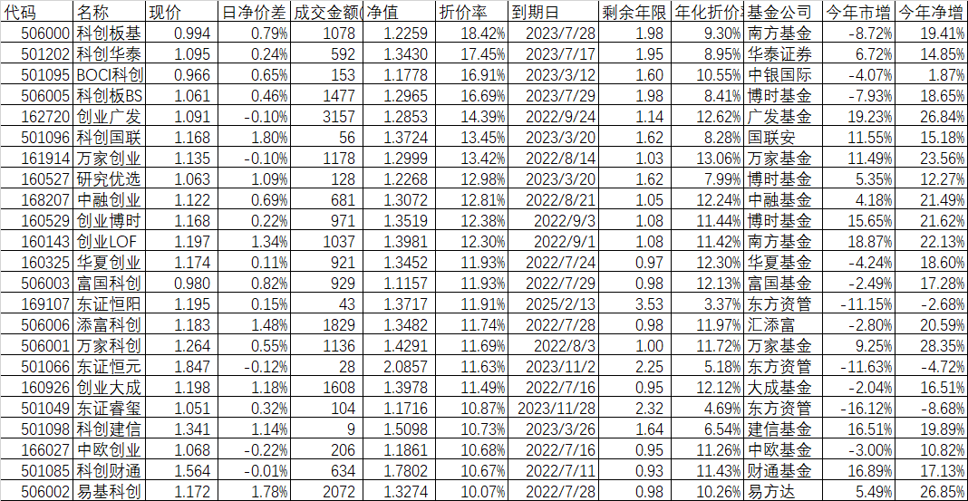 感谢九泰锐益前人投资者的理智,给了我们后人一大块香喷喷的大肉。九泰锐益下周就到期了,唯一还有一只九泰泰富,9月26日也要到期了。不过除了定增基金外,市场上还有不少封基或者定开基金,折价率都不小,下面列出折价率超过10%的封基供参考,因为很多基金都是今年开始上市的,所以今年市增(市价增幅)和今年净增(净值增幅)不是从年头开始算起的,比如在下表中今年净值表现最好的万家科创,净值涨了28.35%,市价才涨了9.25%,但这个9.25%不是从年头开始算起的,即使这样,明年8月3日到期,不到1年的时间,依然有11.69%的折价率。