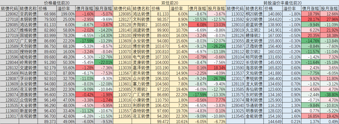 再看双低前20,当月平均价格跌了6.05%,正股平均跌了6.73%,双低的可转债价格跌幅和价格最低的可转债价格跌幅基本上差不多,但正股的跌幅还是差了3%多。这其实说明了双低正股的质量要比最低的正股的质量要好一些。