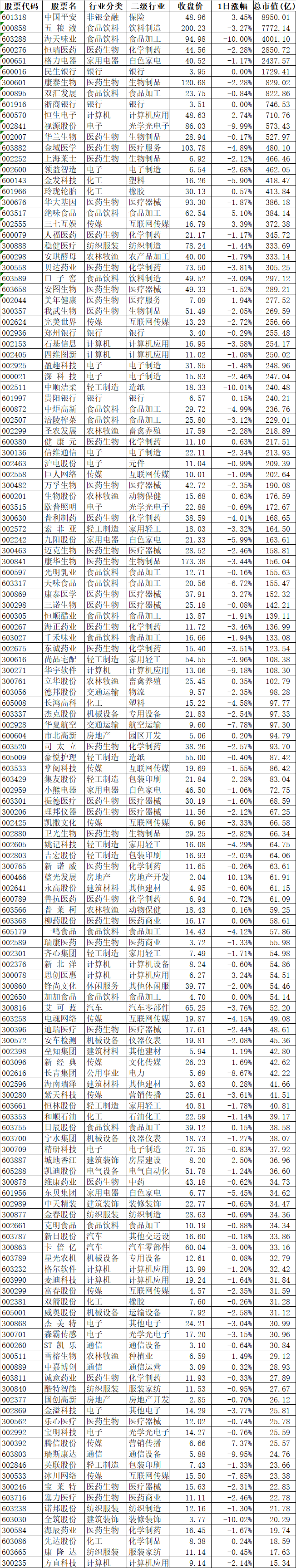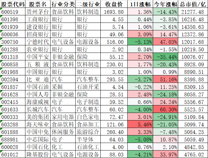 今天是难得茅指数上涨,宁指数下跌的一天,在宽基指数中今天只有创业板和科创板是下跌的,创业板指数下跌了0.98%,科创50指数下跌了0.77%。为了更加直观的看个股,我们在下面列出了A股市值前20名今天的涨跌情况: