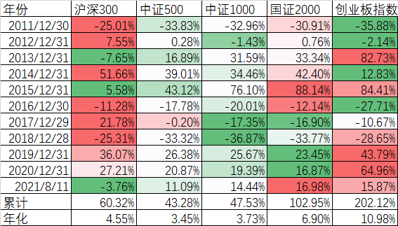 我们再看看这10多年来沪深300、中证1000、国证2000、创业板指数的表现。累计是创业板排名第一,国证2000第二。分年度看,沪深300表现最佳的年度有2011、2012、2014、2016、2017、2018等6年,创业板指数表现最佳的年度有2013、2019、2020等3年,而国证2000表现最佳的年度有2015和今年。反而是中证500和中证1000这十多年来没有一年表现最佳。