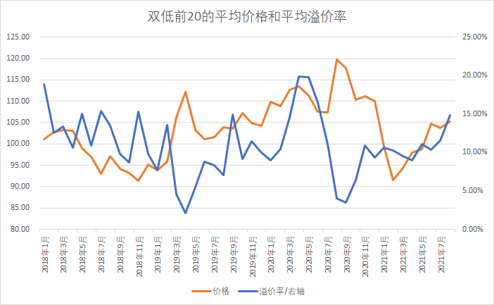 那么问题来了,创了新高的可转债,是否风险就大了呢?我们可以从两个数据来看看它们的历史情况,一个是可转债的价格,一个是可转债的转股溢价率。而影响大的并不是全体可转债的价格和溢价率,而是策略选中的可转债的价格和溢价率,所以这里我们用策略选中的前20只可转债的平均价格和溢价率作为考察对象,先看双低,这里的双低我用了我自己的双排序来替代,差异不是很大的: