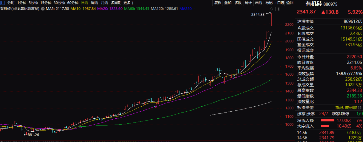 今天行业指数里有个比较特别的指数,有机硅指数(880975),大涨了5.92%,关键不是大涨,每天大涨的指数有的是,但你仔细看看下面的K线,从3月24日开始启动,就几乎没有什么回调过。
