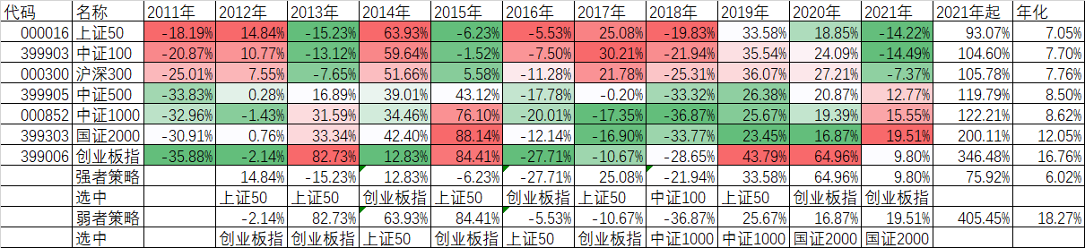 昨天我们讨论的7个宽基指数,如果每年选择上一年最强的或者最弱的指数,那么最终会如何呢?