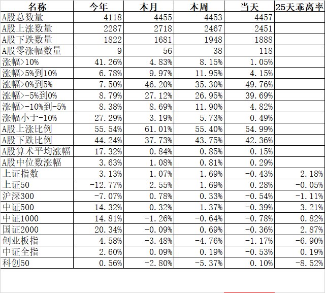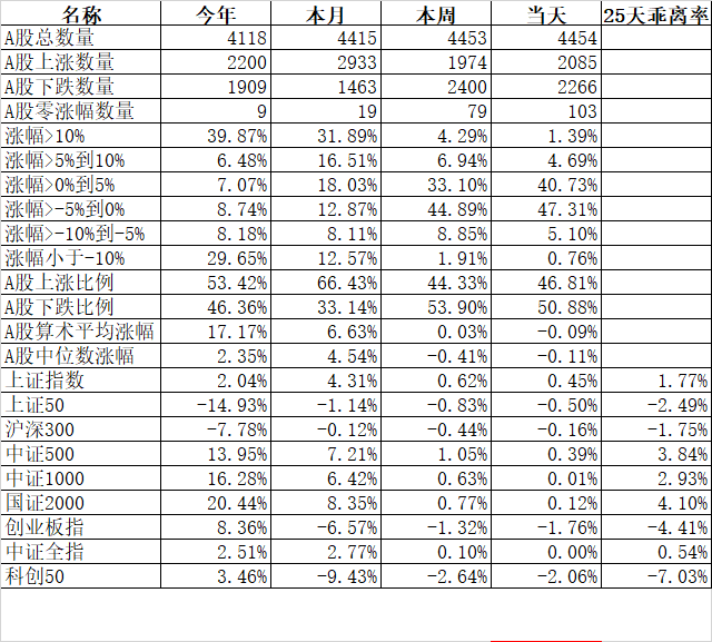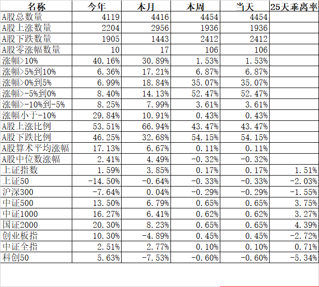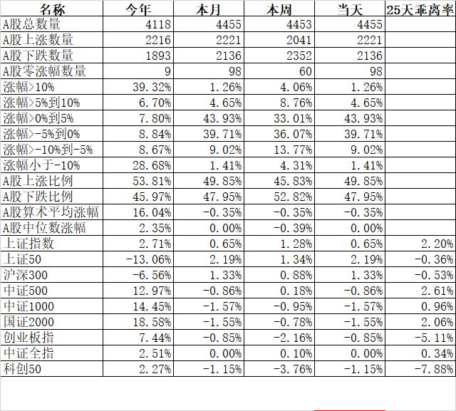 今天25天乖离率最高的是国证2000的4.39%、中证500的3.75%、中证1000的3.27%,最低的是科创50的-5.34%、创业板的-2.72%。