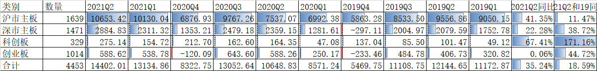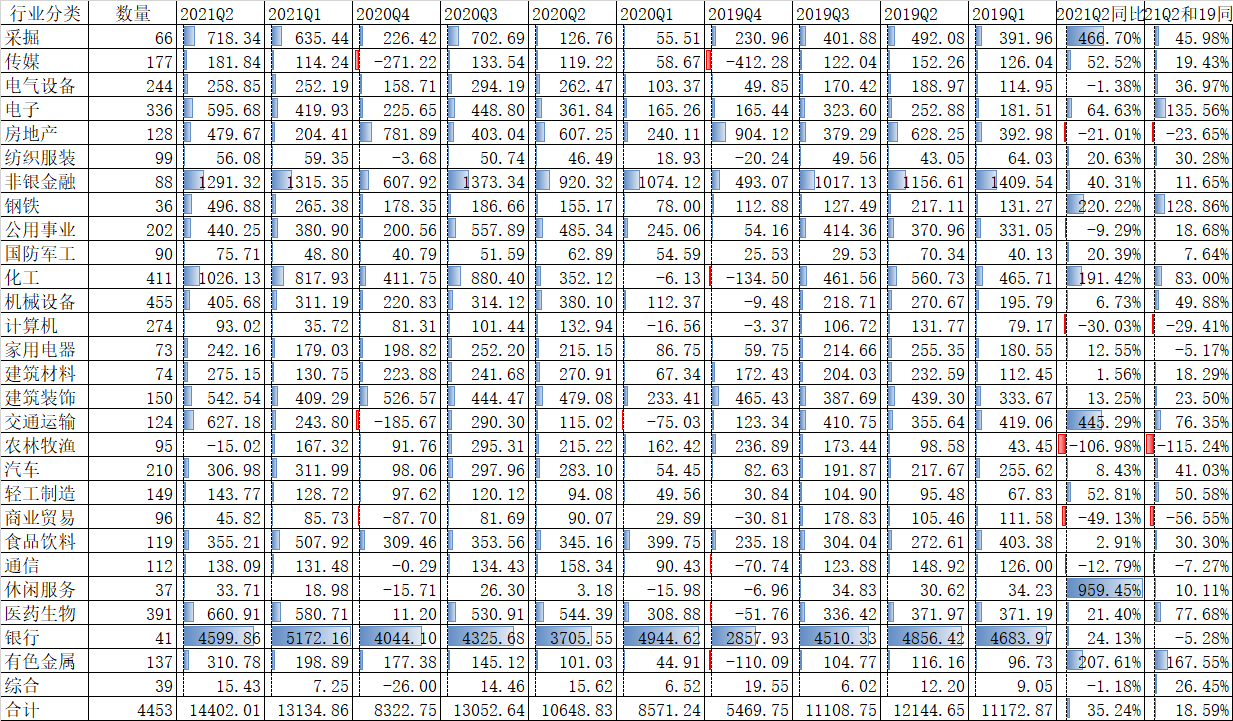 本文主要是对这4453家公司的第2季度归母净利润做一个统计分析。没有说明单位的都是亿元。从整体来说,Q2的1.44万亿归母净利润创了历史最好季度的记录,如果同比2021年Q2,那么增长35.24%是非常惊艳的。但大家知道去年Q2受新冠疫情非常严重,这个季度的归母净利润是有特殊情况的,如果同比2019年Q2,那么增长了18.59%,年化大概是8.9%,也算是个不错的成绩了。