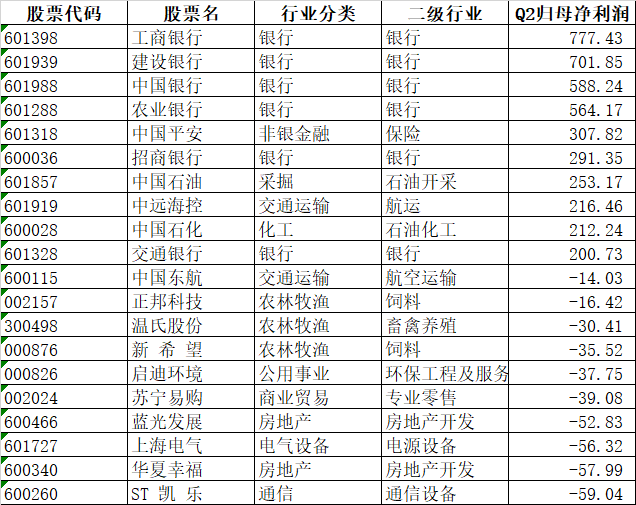 最后我们看一下2季度归母净利润前10后10的公司:前十分别为工商银行、建设银行、中国银行、农业银行、中国平安、招商银行、中国石油、中远海控、中国石化、交通银行,分别盈利了200.73亿到777.43亿不等。亏损最严重的前十名为ST凯乐、华夏幸福、上海电气、蓝光发展、苏宁易购、启迪环境、新希望、温氏股份、正邦科技、中国东航,分别亏损了14.03亿至59.04亿不等。其中正邦、温氏、新希望均是养猪企业。