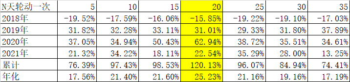 2、 保持BIAS30、平均持有20只ETF基金,从5天到35天轮动一次。结果是在20天轮动一次比较合适: