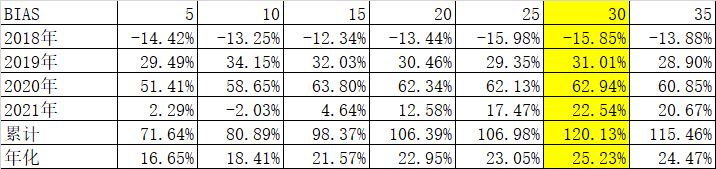1、 我们选BIAS最大的20只ETF基金,每20天轮动一次,对应bias从5天到35天结果如下,整体来说选取BIAS30天比较合适: