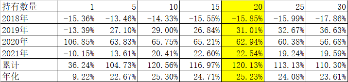 3、 最后我们保持bias30、20天轮动一次不变,持有ETF基金数量从1到30只结果如下,从年化看,10只和20只基本上结果差异不大,如果资金量比较大,还是取20只为佳