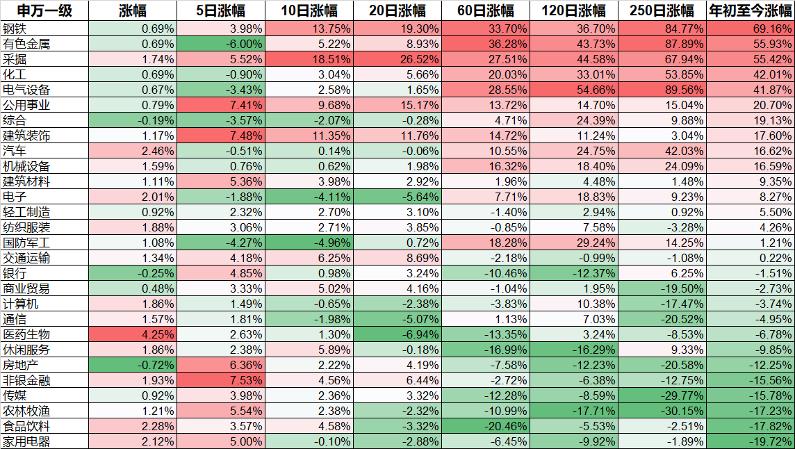 从28个申万一级行业来看,今年涨跌大概是一半对一半。今年最强的钢铁、有色金属、采掘等三个周期行业,都和涨价因素相关。三傻中的银行、房地产,是今天唯一下跌的两个主要行业,其实保险混在非银金融里的,今年的表现也很差,相对来说还是非银金融里的券商稍微好一点,当万亿成交成为常态后,对券商的利好是不言而喻的。今天28个行业里反弹最大的医药生物,完全就是因为跌多了,包括食品饮料、家用电器这两个今年表现最弱的行业,今天出现强烈反弹也是同样的原因。