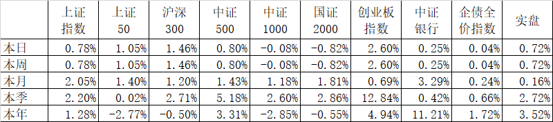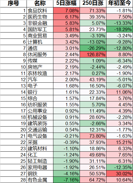 本周行情不错,几乎所有的宽基指数都上涨了,涨幅最大的创业板大涨了4.24%,最小的中证500也上涨了1.26%。在28个申万一级行业指数中,食品饮料大涨了7.08%、医药生物涨了6.17%,跌幅最大的反而是今年表现不错的顺周期的有色金属跌了7.16%、钢铁跌了4.16%。