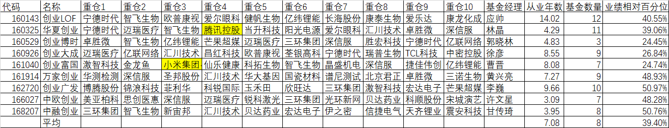 我们再看看它们的最新持仓,除了个别的腾讯、小米等港股外,其他的均是创业板基金,基金经理的平均从业也有7年多,他们平均管理过8只基金,这些基金和同类基金相比的业绩百分位在40%左右,其中博时的郭晓林和富国的曹晋,他们的百分位都在四分之一以上,巧合的是他们的创业博时和创业富国也是今年净值超过7%的最好的两只。