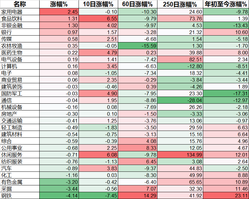 看今天的申万一级指数,今年累计上涨最好的板块依然是钢铁,涨了23.11%,但如果是最近才进去的,那就比较惨了,最近10个交易日跌了7.45%,今天一天就跌了4.14%。再看今天涨幅最大的家用电器,涨了2.45%,但今年依然下跌了9.78%。如果你是追涨杀跌追逐热点的,很容易刚刚进了钢铁就被套住。你花尽心血研究,似乎找到了规律,但真的实战一用,说不定规律离你而去了。股市,确实说爱你不容易。