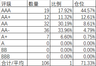 我们再看一个今年表现最好的华商可转债基金,它一共持有106只可转债,虽然AAA等级的可转债只有19只,比例并不高,但市值的比例高达44.57%,而整个可转债的仓位也就是71.33%,也就是说一半以上的仓位都在等级最高的AAA,退市前价格最高的AA-和A+,仓位只占了5.54%。