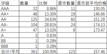 AA等级的最多,占了34.63%,其次是AA-,28.81%;AA+,13.30%;A+,13.02%;AAA,8.86%,A、BB、BBB数量非常少。但我们再来看退市可转债的数据,最高等级的AAA,退市前平均价格是130元左右;而等级相对最低的(已经退市的目前还没有A、BB、BBB)AA-和A+,平均退市前的价格大约是174元,比等级最高的AAA高了整整44元。