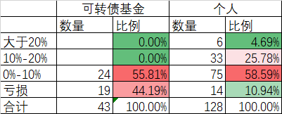 如果对比盈利的比例,可转债基金盈利的比例是55.81%,而个人直接投资可转债盈利的比例高达89.06%,远远超出了可转债基金。