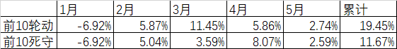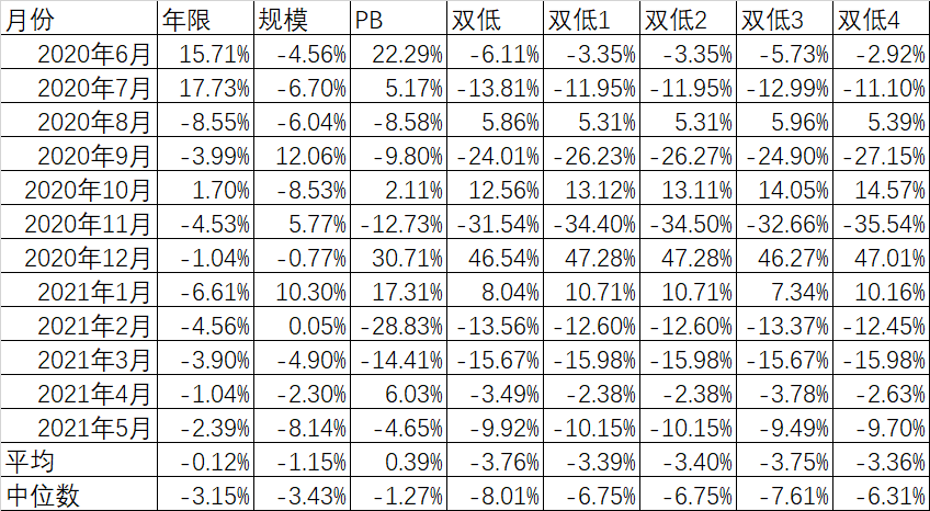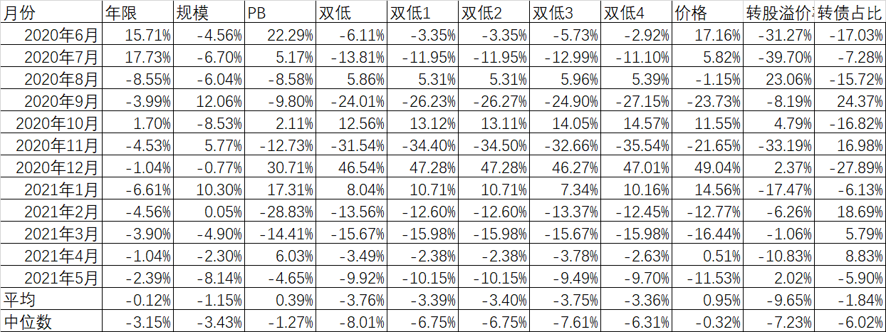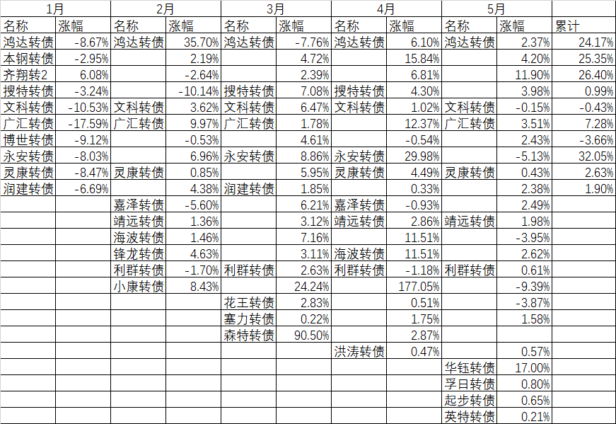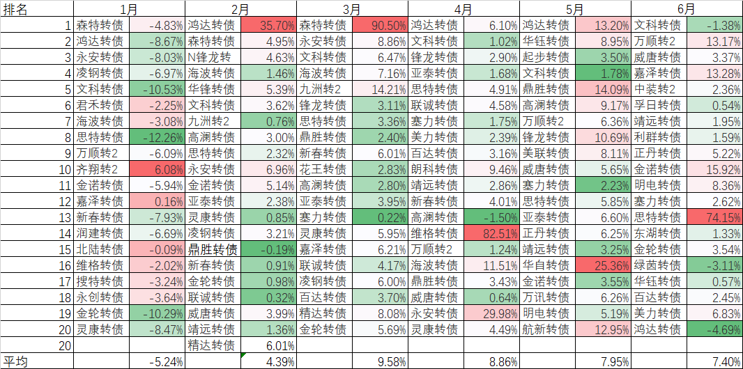 我们再看一下每个月选到的前20名的明细,其中1月份的名单是按照上一年最后一个交易日的数据选出来的,2月份的名单是根据1月份最后一个交易日的数据选出来的,以此类推。如果把一个月涨10%以上定义为妖债,那么这个策略的抓妖记还是非常出色的。除了1月份暴跌颗粒无收,2月份有1只鸿达转债涨了35.70%;3月份有2只森特转债涨90.50%、九洲转2涨14.21%;4月份有3只维格转债涨82.51%、海波转债涨11.51%、永安转债涨29.98%;5月份有5只鸿达转债涨13.20%、鼎胜转债涨14.09%、锋龙转债涨10.69%、华自转债涨25.36%、航新转债涨12.95%;6月份还没结束就有4只:万顺转2涨13.17%、嘉泽转债涨13.28%、金诺转债涨15.92%、思特转债涨74.15%。平均一个月能抓3只左右的妖债。